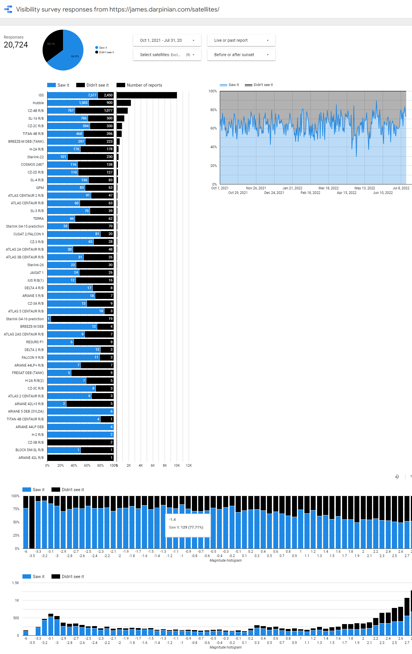 This data is shown in a dashboard I made in Google Data Studio. I had originally intended to use this data to improve my satellite brightness models, but after doing some analysis I concluded that the data was too noisy to be useful for that purpose. It's still good to have some verification that people are seeing the satellites, so I left the survey in.